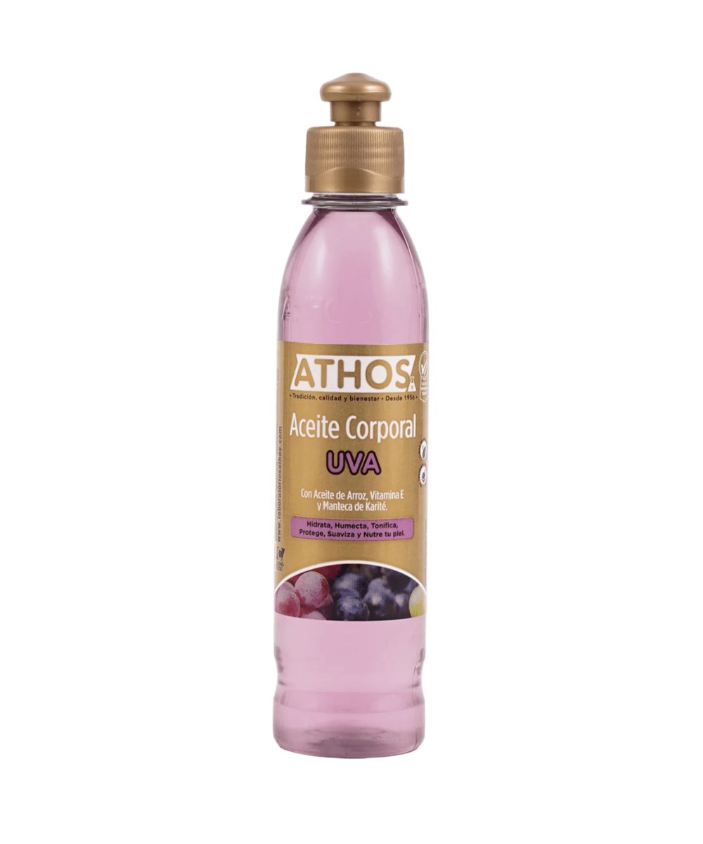 El Aceite Corporal con Uva ATHOS es perfecto para complementar la rutina de cuidado corporal, ayudando a mantener la piel hidratada y con una sensación de suavidad.